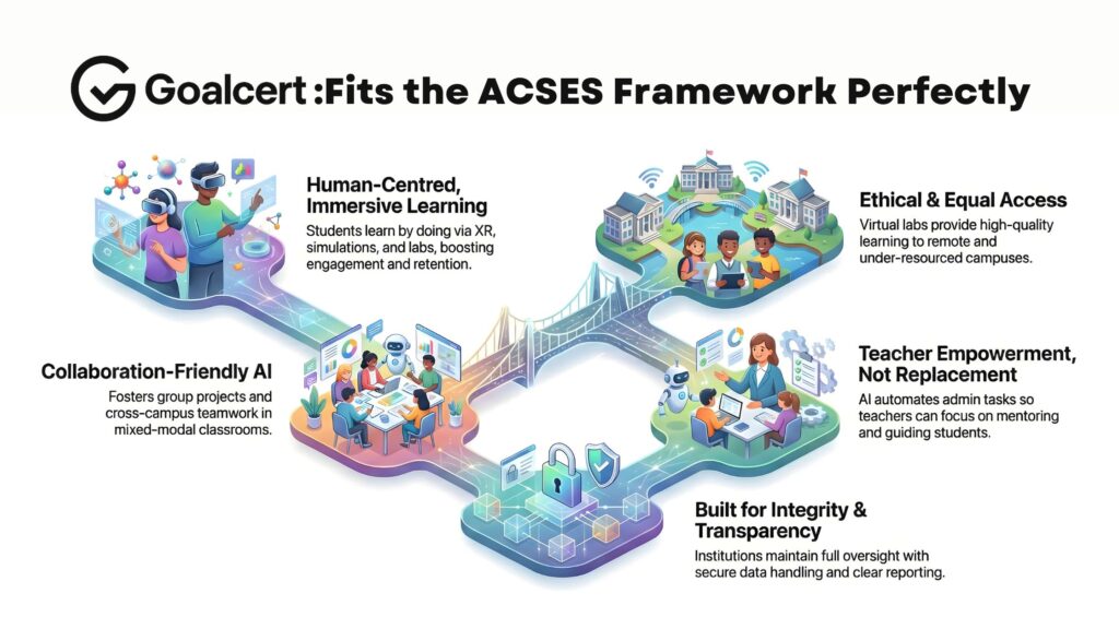 GoalCert supports group projects, cross-campus collaboration, and even global teamwork through mixed-modal classrooms — exactly the kind of inclusive, shared AI environment ACSES encourages.