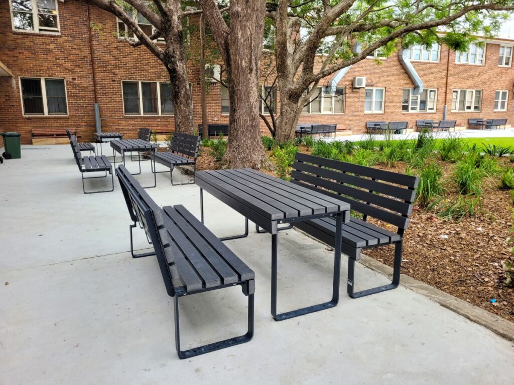 The Avoca setting combines modern design with everyday practicality, making it a standout choice for schools, campuses and community spaces. Built with a galvanised steel frame for superior strength and low maintenance, it features sleek plastiwood slats available in four contemporary colours — with the charcoal finish pictured here offering a bold, sophisticated look.