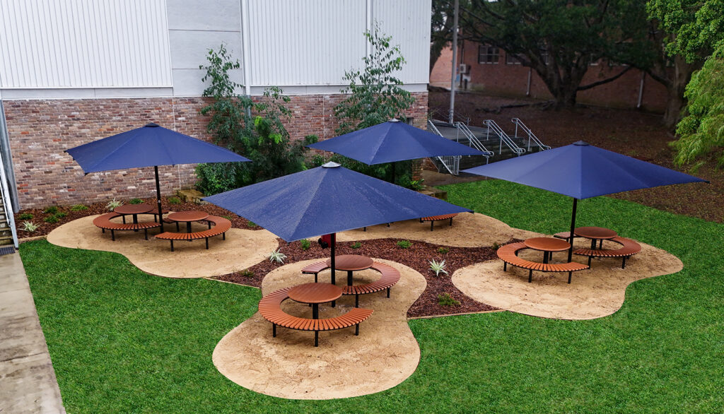 Each Study Pod features our Conrod Double All Access Setting which seats up to 16 people, making them ideal for group work, outdoor classes, or break-time relaxation. Paired with heavy-duty shade umbrellas, they provide reliable protection from the sun throughout the day.