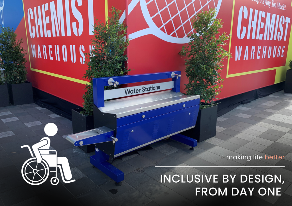 Designed in line with Australian accessibility standards, the CF400 DDA models feature wheelchair-friendly heights, generous knee and toe clearance, and simple one-handed push-button operation. Clear space around each unit allows for comfortable use with mobility aids, helping ensure hydration points are welcoming and usable for everyone across the precinct.